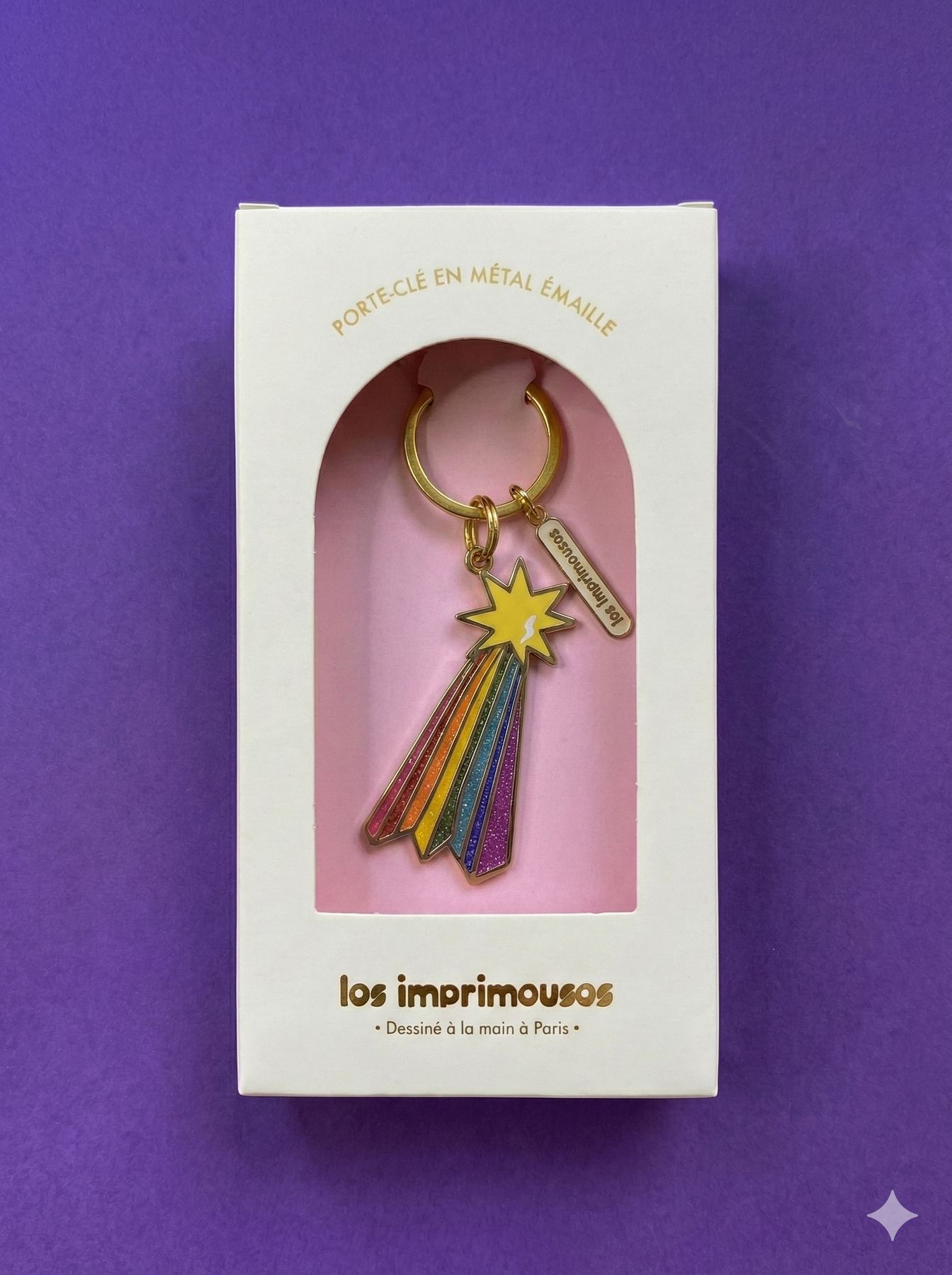 Son étoile phosphorescente capte la lumière et brille dans le noir, tandis que sa traîne arc-en-ciel aux couleurs LGBTQ+ apporte une touche joyeuse, engagée et résolument pop. Accroché à des clés, un sac ou une trousse, il diffuse un message positif et lumineux, partout où il passe.