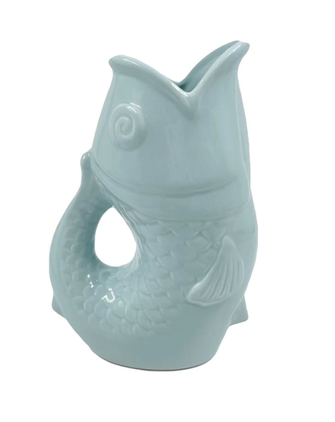 Vase pichet en forme de poisson, finition bleu givré. Idéal pour décorer votre intérieur ou pour accueillir des fleurs fraîches ou séchées. Un objet décoratif original qui apporte une touche ludique et poétique à tout espace.